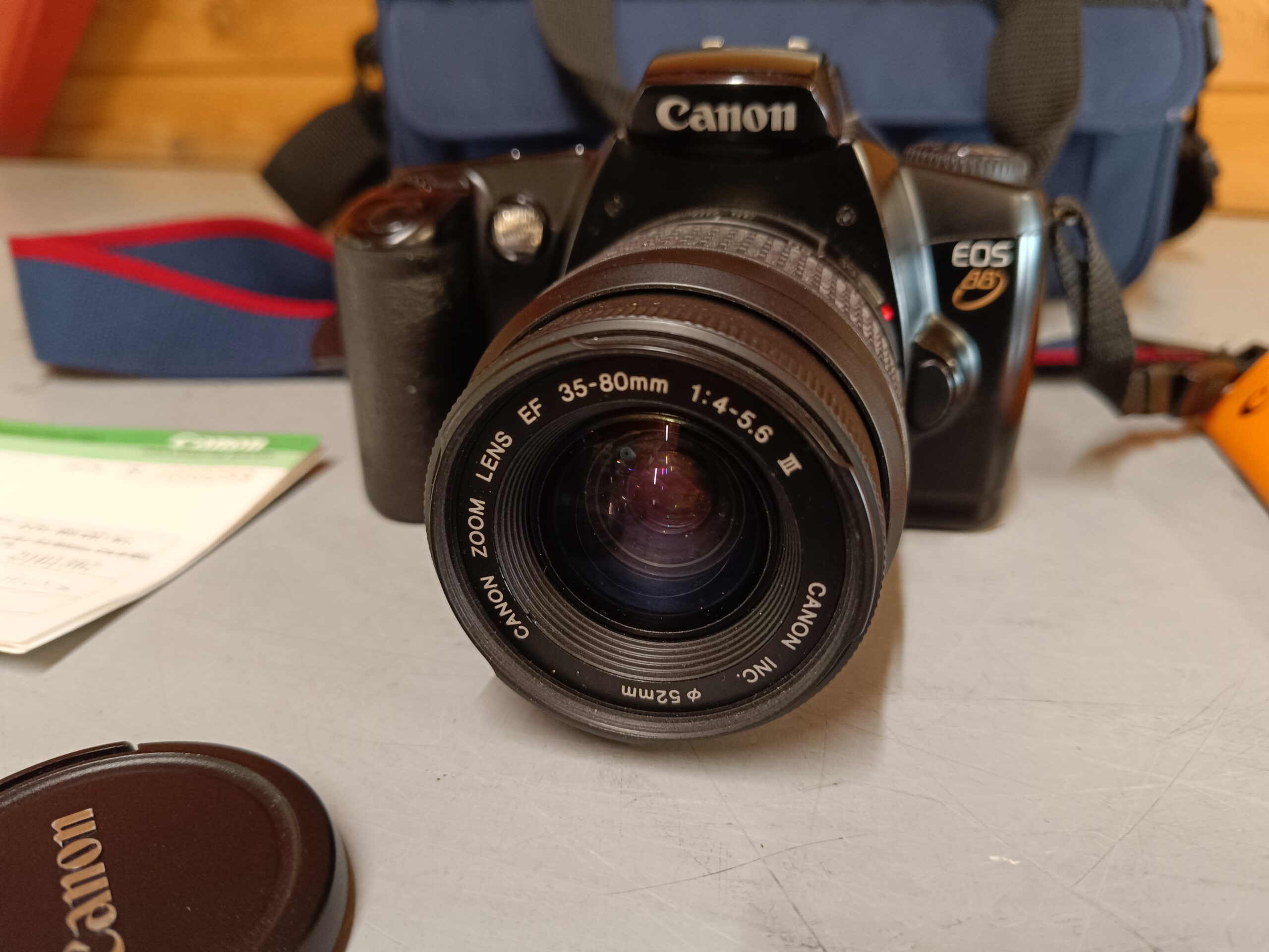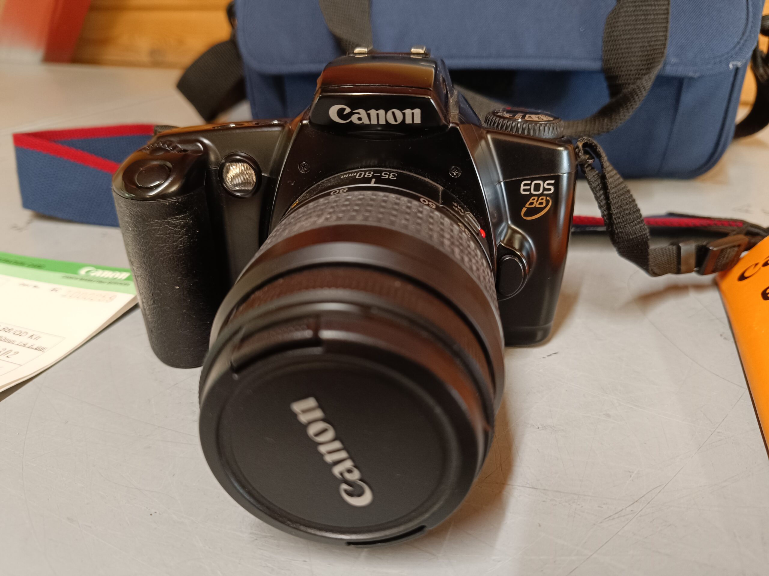 Rigtig pæn og velholdt Canon EOS 88 / EOS 3000 kamera + Canon 35-80mm lens med taske. Kosmetisk og teknisk i pæn stand – kun enkelte brugsspor. 1 ejers. Inkl. manualer, org. købsbevis m.m. – sælges samlet.