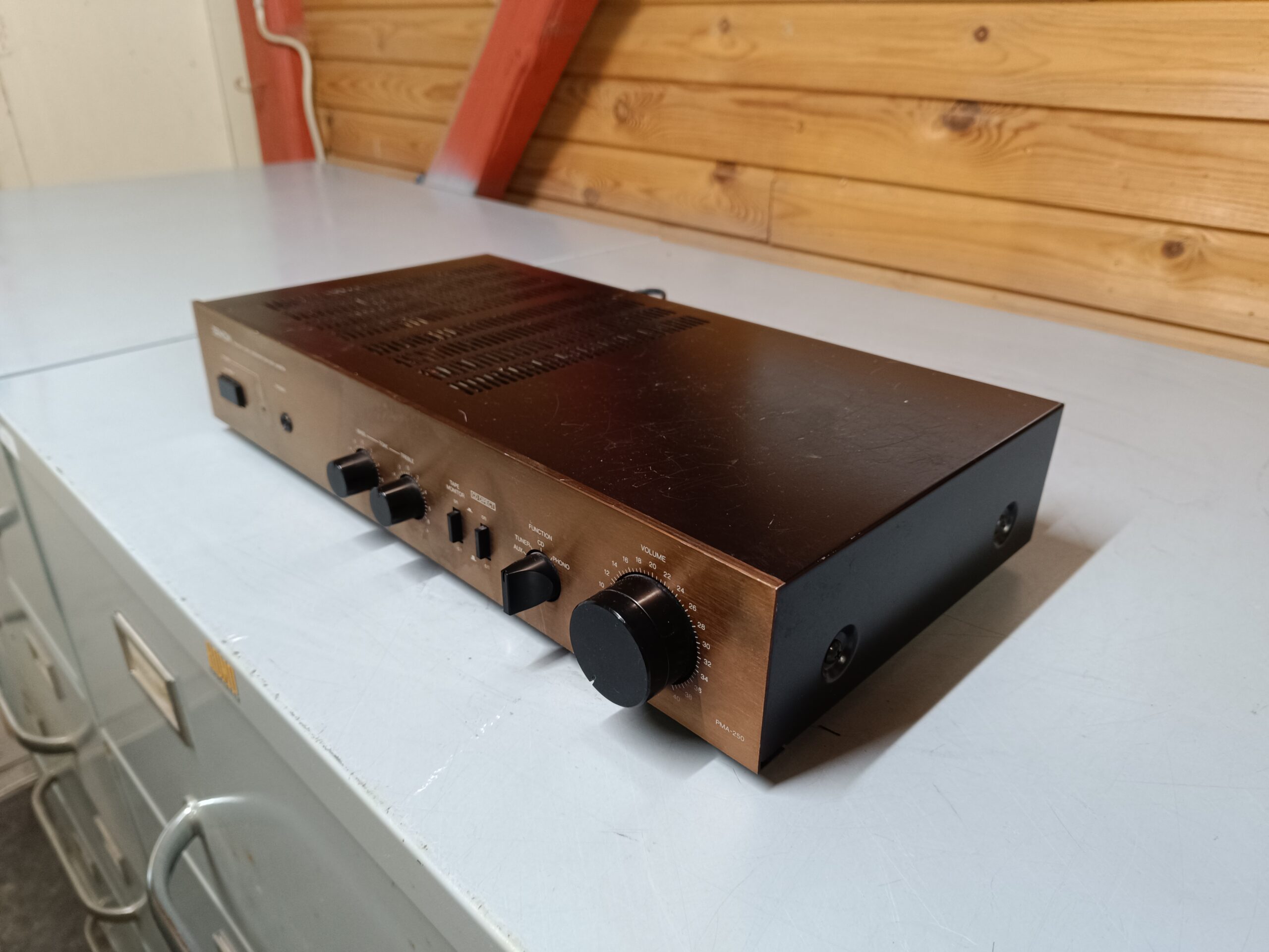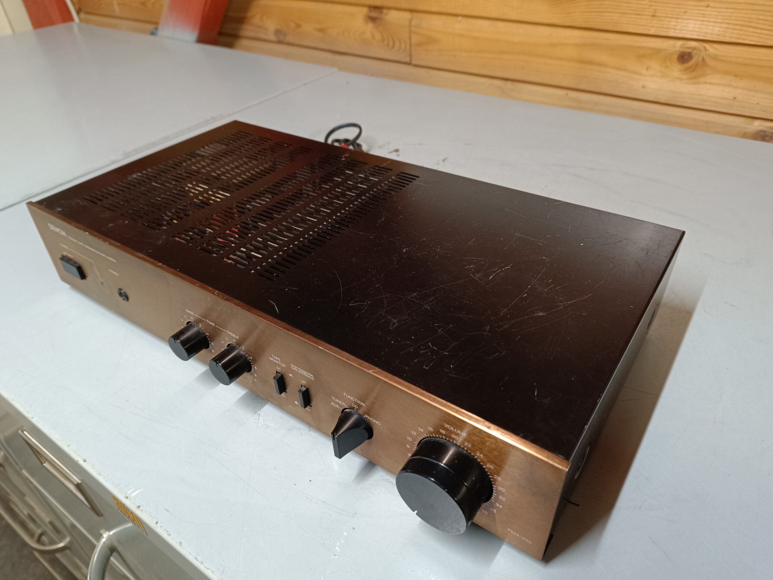 Meget velspillende vintage forstærker fra Denon model PMA-250. Kosmetisk i pæn og velholdt stand – dog med lidt brugsspor/patina – ridser på topdæksel. Årgang 1989. Teknisk i meget fin stand. Forstærkeren er afprøvet, renset, smurt op samt efterfølgende grundigt testet. En velfungerende og fin vintage forstærker, som præsterer langt over størrelse og prisniveau med en meget klar detaljeret lyd samt god dynamik i lydbilledet. En kompakt integreret vintage forstærker fra Denon, som vi varmt kan anbefale.
