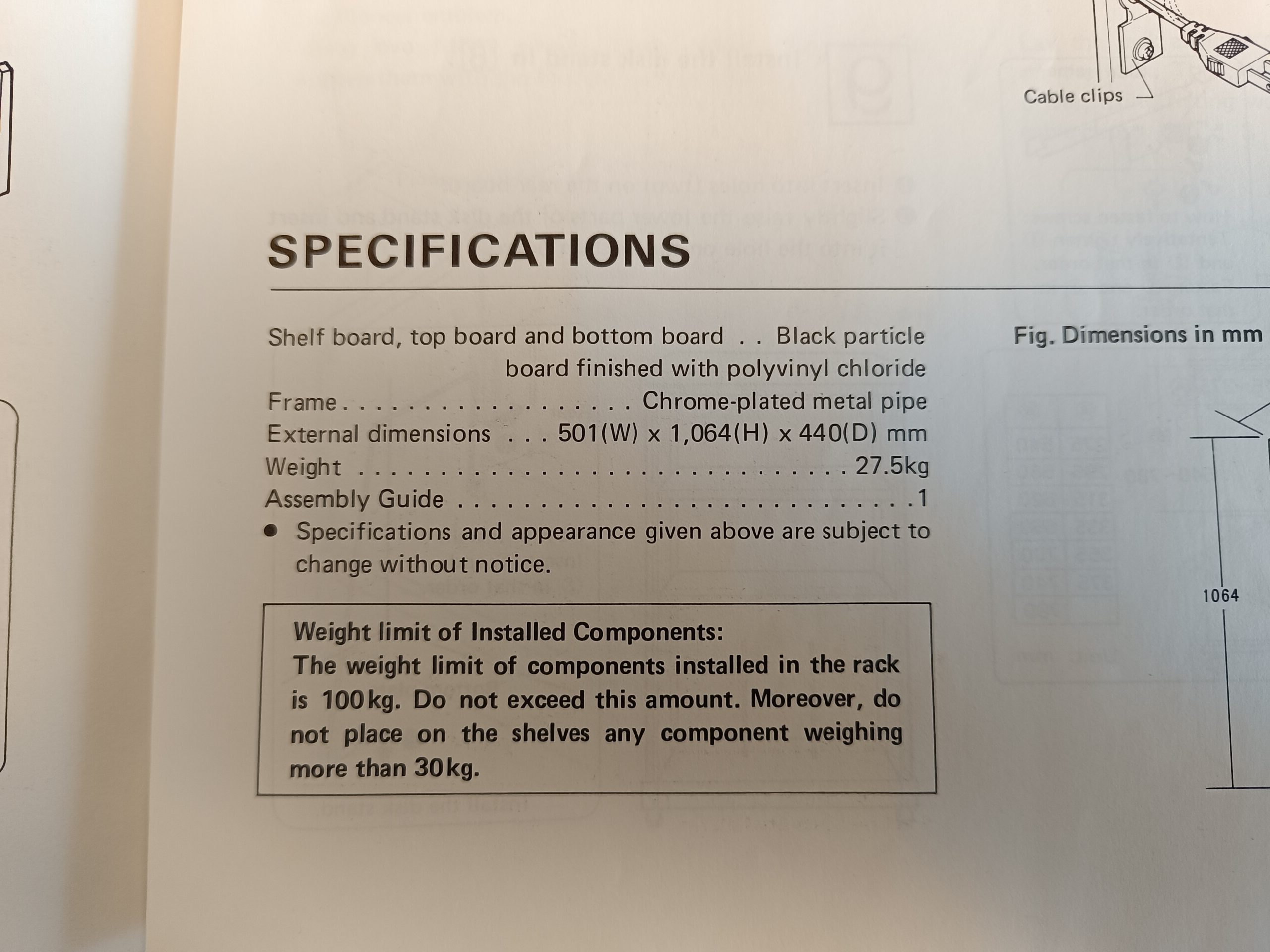 Hver hylde kan bære op til 30 kg og max. 100 kg i alt i kabinettet. Mål: H106,4 x B50,1 x D44 cm. Vægt på 27,5 kg.